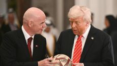 [포토] FIFA 회장한테 서명한 축구 공 받는 트럼프 대통령