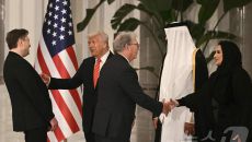 [포토] 트럼프, 카타르 국왕과 인사 위해 줄 선 머스크