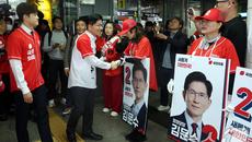 (서울=뉴스1) 이광호 기자 = 김문수 국민의힘 대통령 후보가 15일 오전 서울 구로구 신도림역에서 선거운동원들과 인사나누고- 2025-05-15 09:39