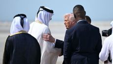 (도하 AFP=뉴스1) 우동명 기자 = 도널드 트럼프 미국 대통령이 14일(현지시간) 도하에 도착해 셰이크 타밈 빈 하마드 알- 2025-05-15 08:44