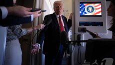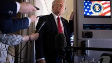 (AFP=뉴스1) 우동명 기자 = 도널드 트럼프 미국 대통령이 14일(현지시간) 카타르로 향하는 전용기에서 취재진을 만나 “튀- 2025-05-15 08:45