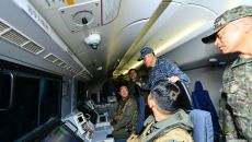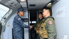 (서울=뉴스1) = 김명수 합참의장이 15일 경남 진해 해군부대에서 해상초계기 P-8A에 탑승해 임무요원들을 격려하고 있다.- 2025-05-15 17:55