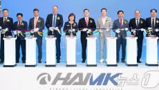 (구미=뉴스1) 정우용 기자 = 15일 열린 하이엠케이 구미공장 준공식에서 김장호 구미시장(오른쪽 네번째)이 LS전선 구본규- 2025-05-15 16:57