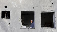 (칸유니스 로이터=뉴스1) 권영미 기자 = 폭격맞은 가자지구 칸유니스의 한 건물에서 15일(현지시간) 한 여성이 밖을 내다보고- 2025-05-15 16:12