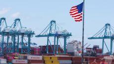 (로스앤젤레스 로이터=뉴스1) 권영미 기자 = 미국 캘리포니아주 로스앤젤레스항에 선적된 컨테이너 위로 미국 성조기가 나부끼고- 2025-05-15 15:38