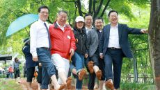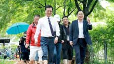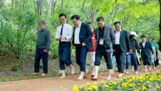 (대전=뉴스1) 이동원 기자 = 조원휘 대전시의장(가운데)과 이장우 대전시장이 15일 오전 개장한 한밭수목원 맨발걷기 산책로를- 2025-05-15 15:07