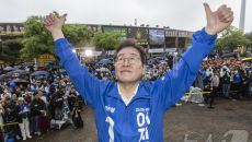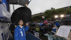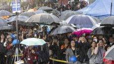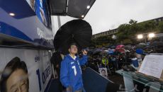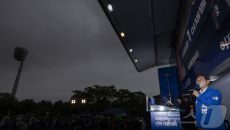 폭우 속 이재명 후보 연설 지켜보는 광양 시민들