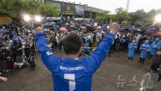 (광양=뉴스1) 안은나 기자 = 이재명 더불어민주당 대통령 후보가 '이순신 호국 벨트' 유세차 15일 전남 광양시 전남드래곤즈- 2025-05-15 14:17