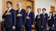 (서울=뉴스1) 장수영 기자 = 조희대 대법원장과 대법관들이 5일 오후 서울 서초구 대법원에서 열린 전국법원장회의에서 국민의례- 3시간전