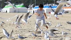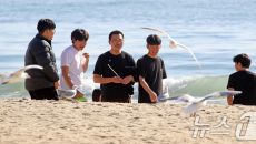 (부산=뉴스1) 윤일지 기자 = 포근한 날씨를 보인 16일 부산 해운대해수욕장에서 반팔 차림을 한 어린이가 갈매기의 군무를 보- 20시간전