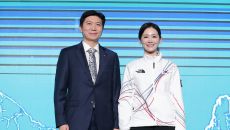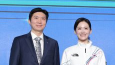 기념촬영하는 유승민 대한체육회장·이수경 선수단장