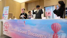 외국인 관광객과 기념촬영하는 최휘영 장관·이부진 위원장