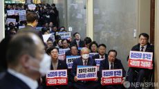 [서울=뉴스핌] 이형석 기자 = 국민의힘 의원들이 30일 오후 서울 여의도 국회 의장실 앞에서 국회의장을 향해 구호를 외치고- 2023-11-30 14:37