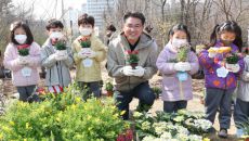 나무심기 참여한 어린이들과 기념촬영하는 오승록 노원구청장