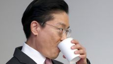 기자회견 중 물 마시는 전인석 삼천당제약 대표