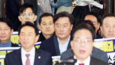 국민의힘 송언석 원내대표 등 의원들이 12일 국회 로텐더홀에서 열린 4심제 위헌악법 규탄대회를 연 가운데 더불어민주당 의원들이- 1시간전