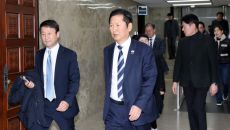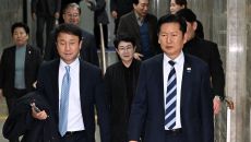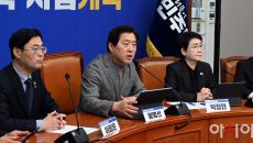 아시아투데이 송의주 기자 = 정청래 더불어민주당 대표(가운데)가 22일 국회에서 열린 비공개 의원총회에 참석하며 동료의원들과- 5분전