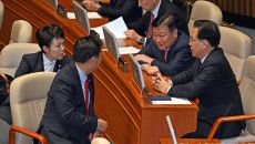 아시아투데이 송의주 기자 = 정청래 더불어민주당 대표(맨 왼쪽)가 15일 국회에서 열린 본회의에서 동료의원들과 이야기를 나누고- 4시간전