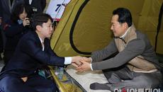 아시아투데이 송의주 기자 = 장동혁 국민의힘 대표가 21일 국회 로텐더홀에 마련된 단식 농성장에서 이준석 개혁신당 대표를 만나- 9시간전