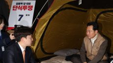 아시아투데이 송의주 기자 = 장동혁 국민의힘 대표(오른쪽)가 21일 국회 로텐더홀에 마련된 단식 농성장에서 이준석 개혁신당 대- 9시간전