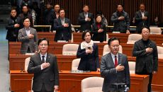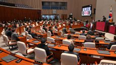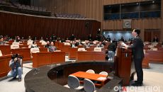 아시아투데이 송의주 기자 = 송언석 국민의힘 원내대표(맨 앞줄 왼쪽)를 비롯한 의원들이 22일 국회에서 열린 긴급 의원총회에서- 1시간전