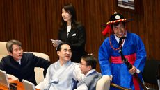 아시아투데이 이병화 기자 = 윤종오 진보당 원내대표가 12일 국회에서 열린 본회의에서 포도대장 복장으로 참석하고 있다. ⓒ "- 3시간전