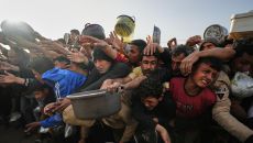 18일 팔레스타인 가자지구 남부 칸유니스에서 주민들이 앞다퉈 음식 배급 그릇을 내밀고 있다. 이날은 이슬람 성월인 ‘라마단’의- 9시간전