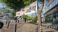 고개 숙여야 지나가는 이준석 후보 현수막…시민안전 위협 지적