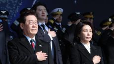 20日,陆海空军士官学校军官联合授衔仪式在忠清南道三军总部所在地鸡龙台举行。图为李在明与夫人金惠景在仪式上向国旗敬礼。 李雅贤 记者 yax- 20분전