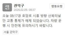 서울 관악구 산복터널 안 교통 통제가 해제됐다. 9일 관악구는 안전재난문자를 통해 "이날 오전 8시 17분경 호암로 시흥 방향- 13시간전