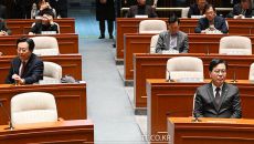 [더팩트ㅣ국회=남용희 기자] 22일 오후 서울 여의도 국회에서 의원총회가 열린 가운데 장동혁 국민의힘 대표의 자리(왼쪽 아래)- 1시간전
