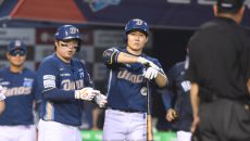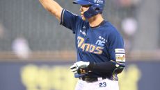 NC 천재환이 17일 서울 잠실구장에서 열린 2025 KBO리그 LG와 경기 5회초 우전안타를 친 후 세리머니를 하고 있다.- 2025-06-17 20:02