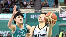KB스타즈 강이슬(왼쪽)이 9일 부천체육관에서 열린 2025-2026 여자프로농구 하나은행과 경기에서 하나은행 박진영의 수비를- 42분전
