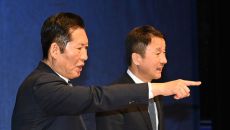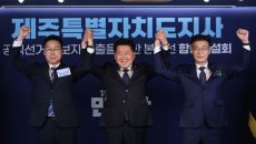 [제주=뉴시스] 양영전 기자 = 더불어민주당 제주도지사 경선후보인 위성곤 의원과 오영훈 제주지사, 문대림 의원(기호순)이 합동- 2026-04-06 15:22
