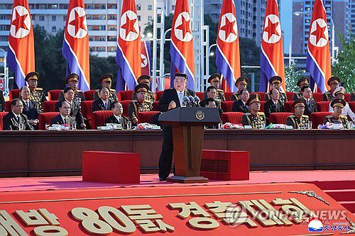 (평양 조선중앙통신=연합뉴스) 김정은 북한 국무위원장이 지난 14일 평양 개선문광장에서 열린 조국해방(광복) 80주년 경축대회에 참석해 연설을 했다고 조선중앙통신이 15일 보도했다. 2025.8.15 [국내에서만 사용가능. 재배포 금지. For Use Only in the Republic of Korea. No Redistribution] nkphoto@y