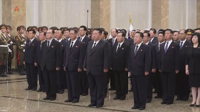 [서울=뉴시스] 김정은 북한 국무위원장이 7월 8일 김일성 주석 사망 31주기를 맞아 금수산태양궁전을 참배하고 있다. 김 위원장은 이날 0시 금수산태양궁전을 찾았으며 박태성, 최룡해, 조용원 등 당 중앙위원회 정치국 상무위원 및 당정 간부 등이 동행했다. (사진=조선중앙TV 캡쳐) 2025.08.15. photo@newsis.com *재판매 및 DB 금지