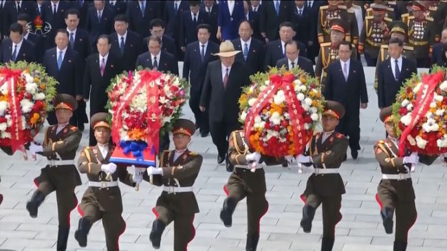 [서울=뉴시스] 북한 조선중앙TV는 김정은 북한 국무위원장이 북한이 '조국해방의 날'이라고 부르는 광복절을 하루 앞둔 14일 대성산혁명열사릉을 참배했다고 15일 보도했다. (출처=조선중앙TV 캡쳐) 2025.08.15. photo@newsis.com *재판매 및 DB 금지 [사진 영상 제보받습니다] 공감언론 뉴시스가 독자 여러분의 소중한 제보를 기다립니다.