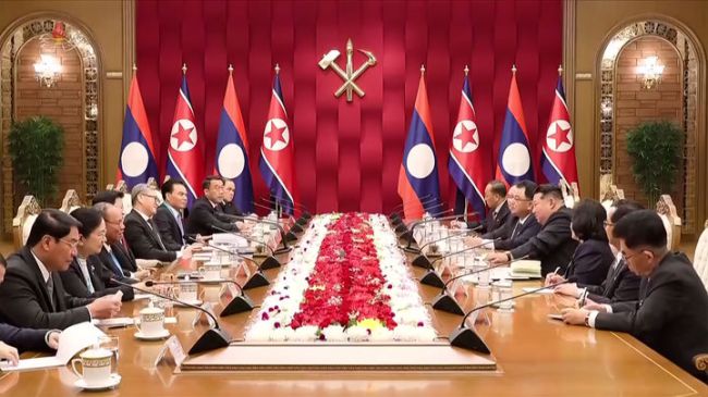 [서울=뉴시스] 북한 조선중앙TV는 지난 7일 김정은 북한 국무위원장이 노동당 창건 80주년 경축 행사 참석을 위해 북한을 찾은 통룬 시술릿 라오스 국가주석과 양자 회담을 했다고 8일 보도했다. (사진=조선중앙TV 캡쳐) 2025.10.08. photo@newsis.com *재판매 및 DB 금지 [사진 영상 제보받습니다] 공감언론 뉴시스가 독자 여러분의 소