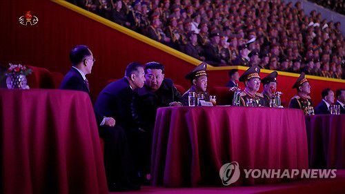 (서울=연합뉴스) 김정은 북한 국무위원장이 지난 12일 노동당 창건 80주년 경축행사 참가자들을 축하격려하고 대집단체조와 예술공연을 함께 관람했다고 조선중앙TV가 13일 보도했다. 김 위원장이 장룡식 당 중앙위원회 부부장과 대화하고 있다. [조선중앙TV화면] 2025.10.13 [국내에서만 사용가능. 재배포 금지. For Use Only in the Rep