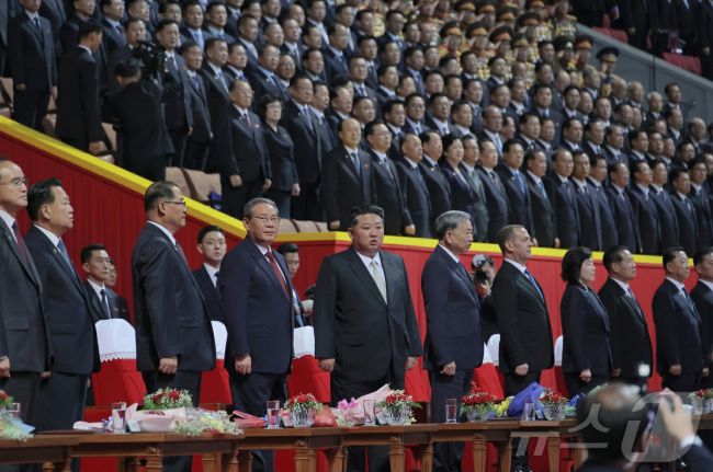 (평양 노동신문=뉴스1) = 지난 9일 열린 북한의 노동당 창건 80주년 기념 경축대회에서 김정은 노동당 총비서 오른쪽에 중국 서열 2위인 리창 국무원 총리, 왼쪽에 베트남 권력 서열 1위인 또 럼 베트남 공산당 서기장이 자리하고 있다. [국내에서만 사용가능. 재배포 금지. DB 금지. For Use Only in the Republic of Korea.