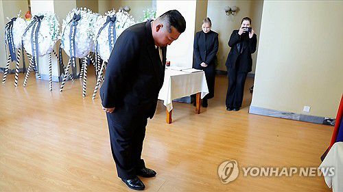 (서울=연합뉴스) 김정은 북한 국무위원장이 알렉산드르 마체고라 주북 러시아 대사가 사망한 것과 관련해 지난 10일 러시아 대사관을 조의 방문했다고 조선중앙TV가 11일 보도했다. [조선중앙TV 화면] 2025.12.11 [국내에서만 사용가능. 재배포 금지. For Use Only in the Republic of Korea. No Redistribution