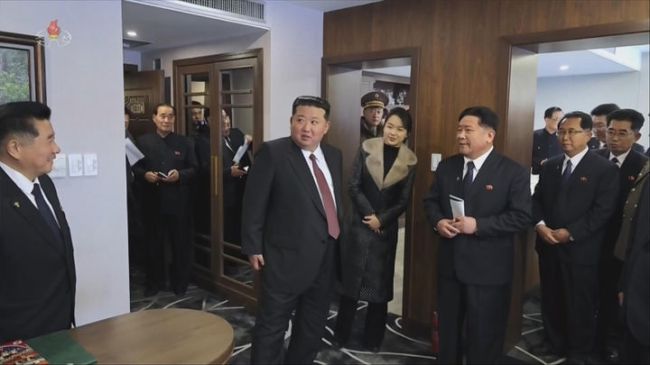 [서울=뉴시스] 북한조선중앙TV는 김정은 북한 국무위원장이 딸 주애와 함께 지난 20일 양강도 삼지연관광지구 이깔·밀영 호텔 준공식에 참석했다고 23일 보도했다. 사진은 이깔 호텔 둘러보는 김정은 국무위원장과 딸 주애. (사진=조선중앙TV 캡쳐) 2025.12.23. photo@newsis.com *재판매 및 DB 금지 [서울=뉴시스] 류현주 남빛나라 기자