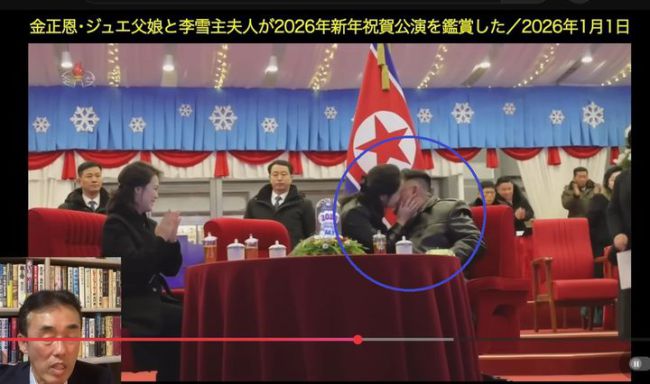 [서울=뉴시스]김정은 북한 국무위원장의 딸 주애가 지난 지난해 12월31일부터 올해 1월1일까지 열린 신년 축하 공연 행사에서 김정은 위원장 볼에 뽀뽀를 하고 있는 모습. (사진출처: 고영기 유튜브 채널 캡처) 2025.01.06. [서울=뉴시스]김혜경 기자 = 김정은 북한 국무위원장과 딸 주애의 공개 행보를 두고 "일반적인 부녀 관계로 보기 어렵다"는 일