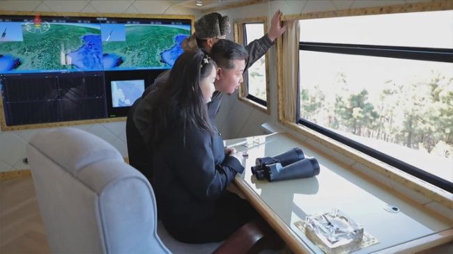 북한 대구경방사포 무기체계 시험사격 현장 찾은 김정은-김주애