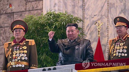 (서울=연합뉴스) 김정은 국무위원장이 지난 25일 밤 평양 김일성광장에서 열린 노동당 제9차대회 기념 열병식 주석단에서 열병종대 행진을 지켜보며 주먹을 쥐어 들어 보이고 있다. [조선중앙TV 화면] 2026.2.26 [국내에서만 사용가능. 재배포 금지. For Use Only in the Republic of Korea. No Redistribution]