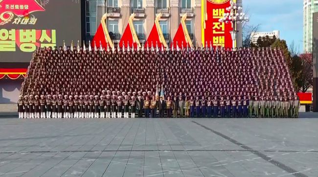 [서울=뉴시스] 김정은 북한 국무위원장이 지난 27일 노동당 제9차대회 기념 열병식 참가 부대 지휘관·병사들을 만나 기념사진을 찍었다고 북한 조선중앙TV가 28일 보도했다. (사진=조선중앙TV 캡처) 2024.02.09. photo@newsis.com *재판매 및 DB 금지 [사진 영상 제보받습니다] 공감언론 뉴시스가 독자 여러분의 소중한 제보를 기다립니다