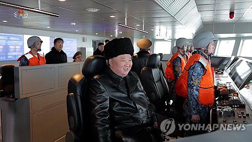 (서울=연합뉴스) 김정은 북한 국무위원장이 지난 3~4일 취역을 앞둔 5천t급 신형 구축함 '최현호'를 찾아 항해시험에 직접 탑승해 훈련 실태를 점검하고 함대지 전략순항미사일 시험발사를 참관했다고 조선중앙TV가 5일 보도했다. [조선중앙TV 화면] 2026.3.5 [국내에서만 사용가능. 재배포 금지. For Use Only in the Republic of