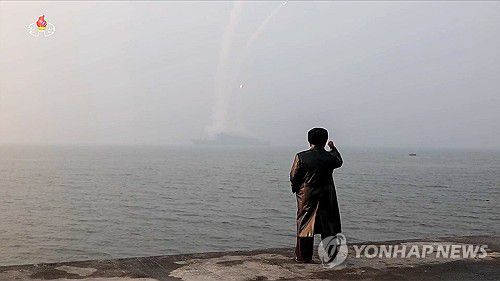 (서울=연합뉴스) 김정은 북한 국무위원장이 지난 3~4일 취역을 앞둔 5천t급 신형 구축함 '최현호'를 찾아 훈련 실태를 점검하고 함대지 전략순항미사일 시험발사를 참관했다고 조선중앙TV가 5일 보도했다. 김 위원장이 구축함에서 미사일 5발이 잇따라 발사되는 장면을 지켜보며 주먹을 치켜들고 있다. [조선중앙TV 화면] 2026.3.5 [국내에서만 사용가능.
