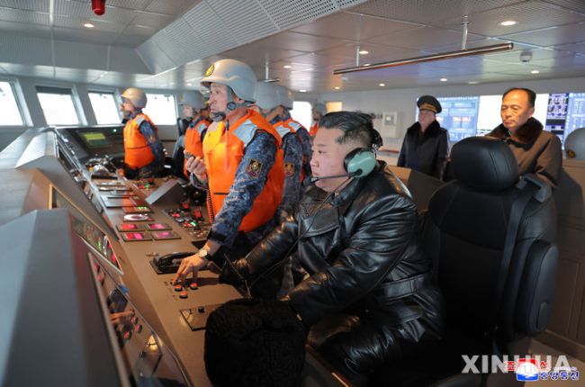[평양=신화/뉴시스] 북한 조선중앙통신(KCNA)이 5일 배포한 사진에 김정은 북한 총비서가 남포 조선소에 있는 '최현' 구축함에 승선해 장병들의 함정 운용 상황과 각종 무기체계의 작전 준비 태세를 점검하고 있다. 통신은 김 총비서가 지난 3~4일 이틀간 최현호에 올라 "해상 핵 무장화가 만족스럽게 수행되고 있다"라고 말했다고 보도했다. 2026.03.05