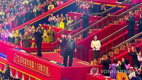 (서울=연합뉴스) 김정은 북한 국무위원장이 아내 리설주 여사, 딸 주애와 함께 지난 8일 평양체육관에서 열린 3·8 국제부녀절(세계 여성의 날) 기념 공연을 관람했다고 조선중앙TV가 9일 보도했다. [조선중앙TV 화면] 2026.3.9 [국내에서만 사용가능. 재배포 금지. For Use Only in the Republic of Korea. No Redis